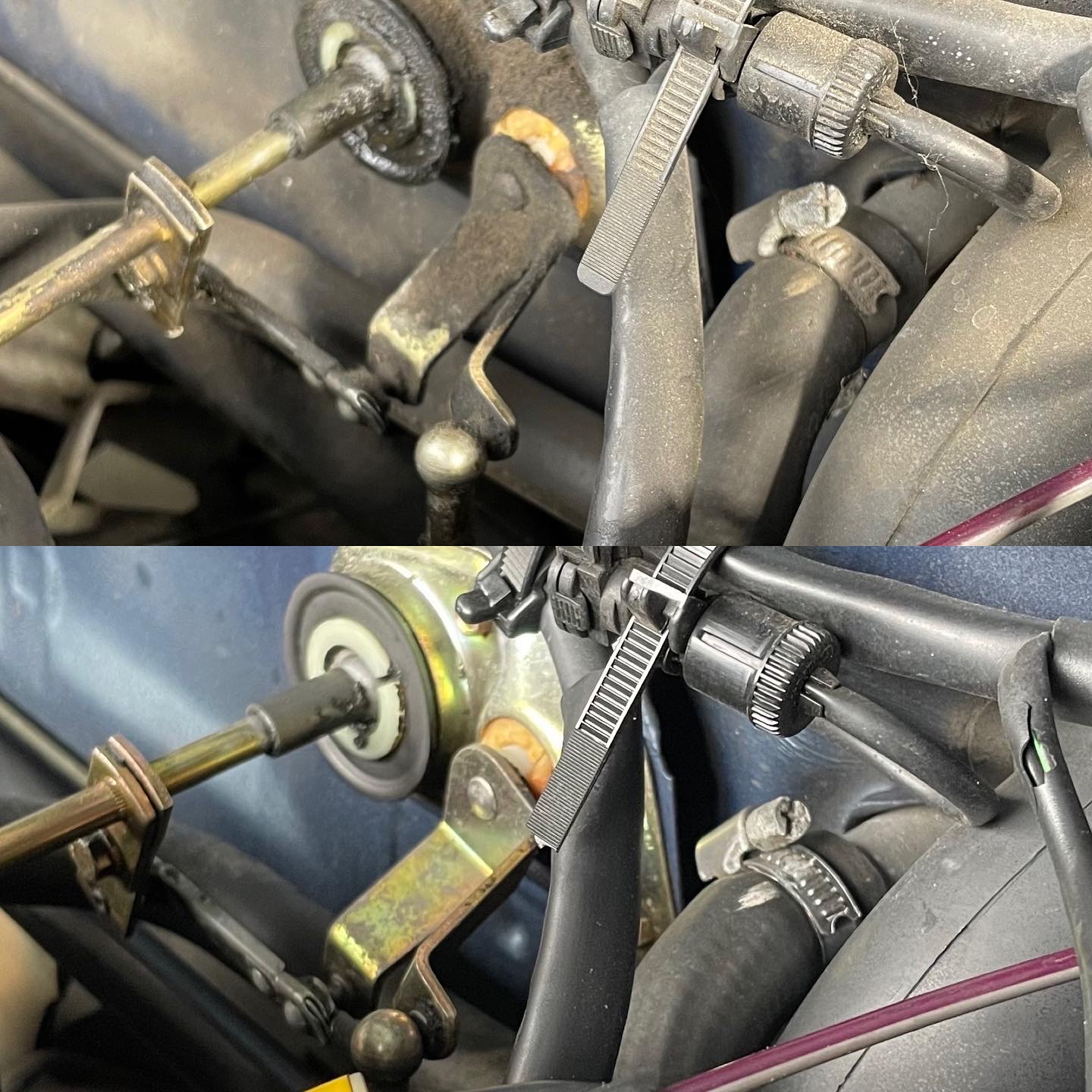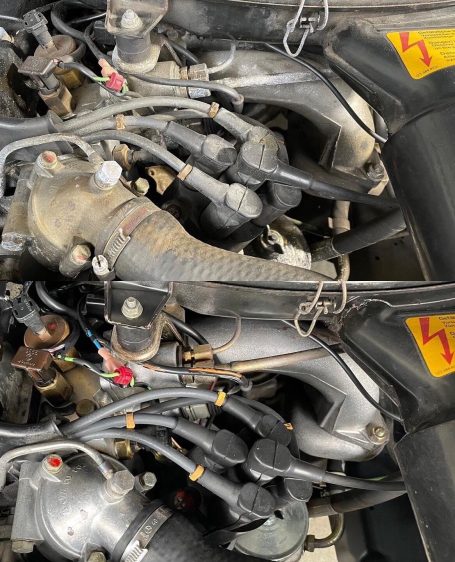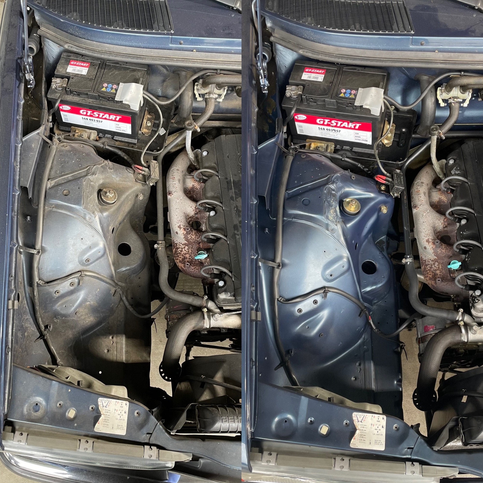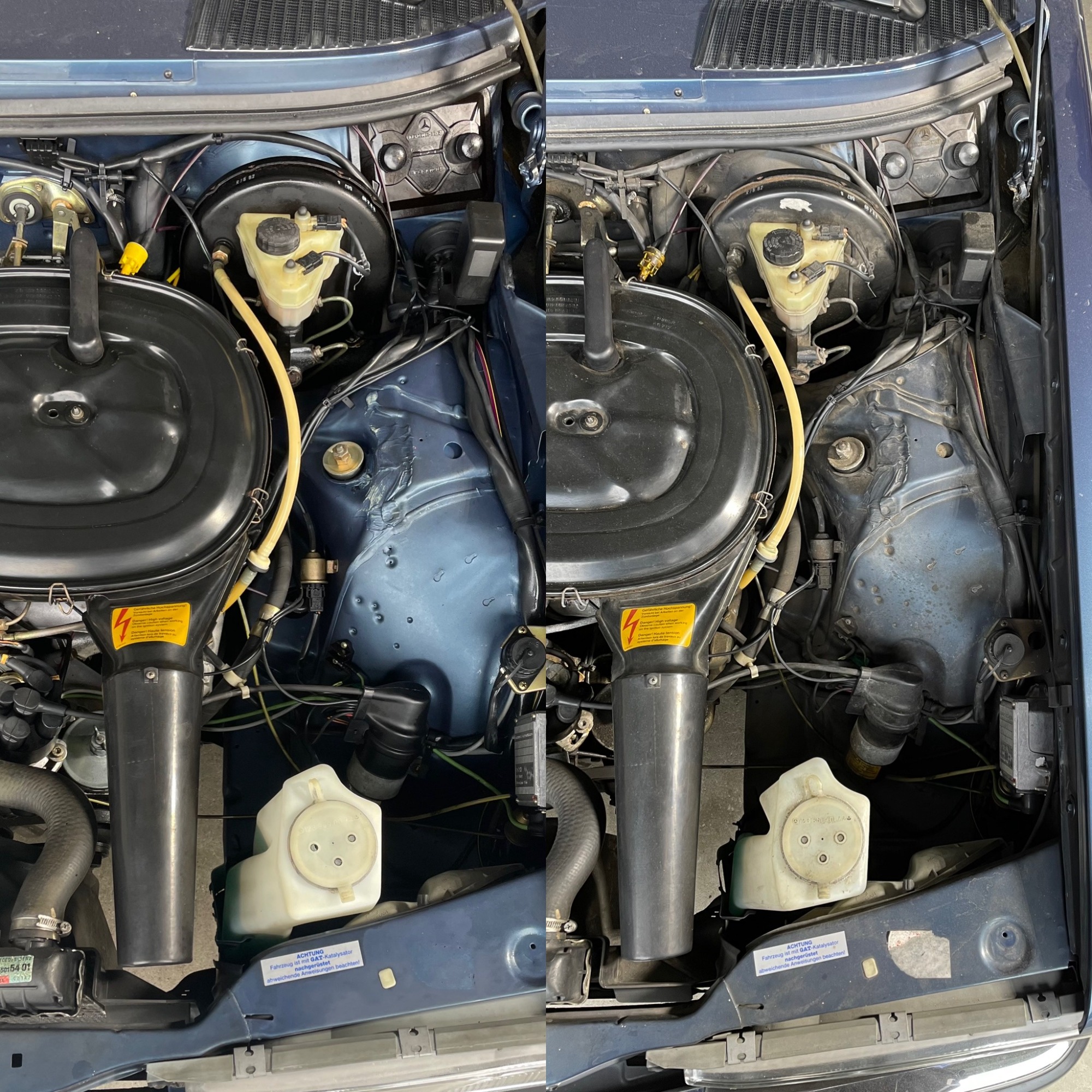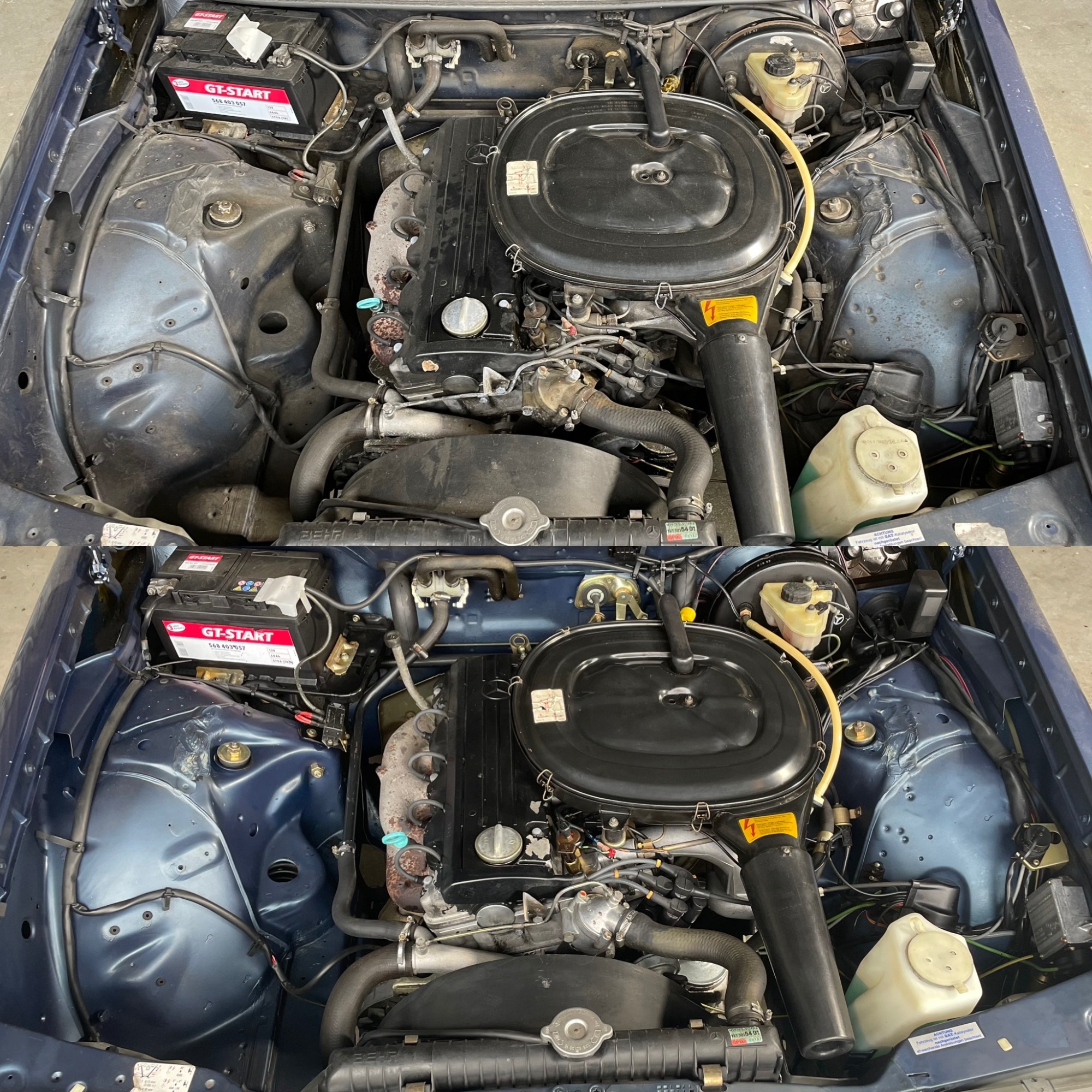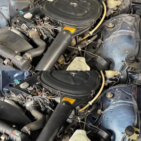 Reinigungsarbeiten im Motorraum eines Mercedes W123 230